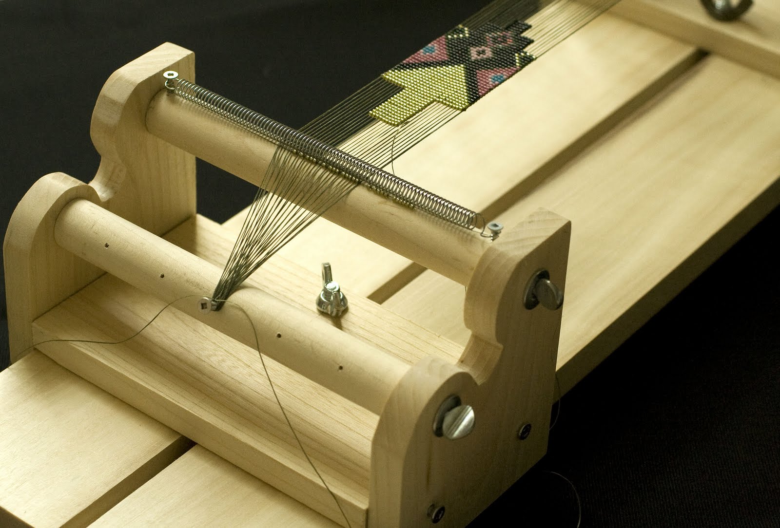This is a picture of my homemade loom with a pendant started on it. After looking at pictures of various looms, and also understanding that you can warp a loom in a way that you don't have ends to deal with, I designed this one with the help of my very talented husband. There are still some tweaks to do on the design, but overall it works really well and can be used with various techniques.